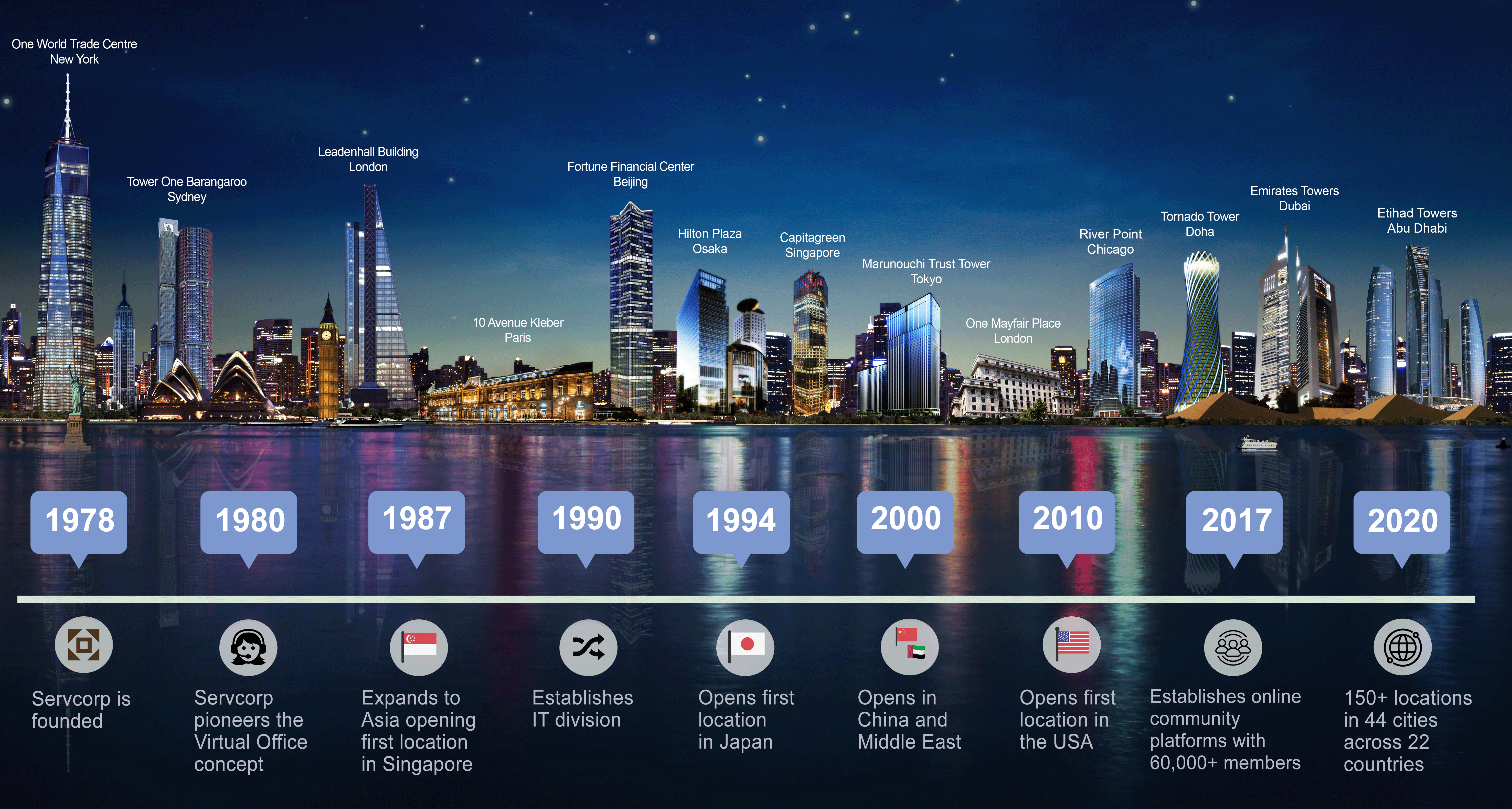 In 1978 from a corner office in the MLC Centre Sydney Australia Mr. Alf Moufarrige took a piece a chalk to divide up the space - and Servcorp was born! The idea took hold and evolved organically and in just 12 months, a full 2 floors within the MLC Centre were occupied along with 1 location in Melbourne.